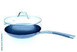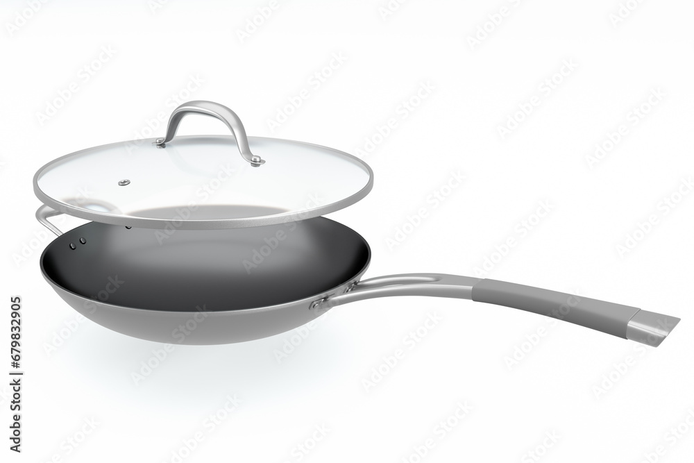 Stainless steel frying pan with glass lid and chrome cookware on white