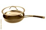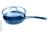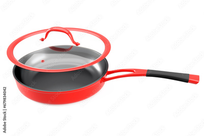 Stainless steel red frying pan with glass lid and chrome cookware on white