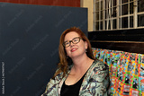 south african redhead woman with glasses smiling, indoors in the room window with burglar bars