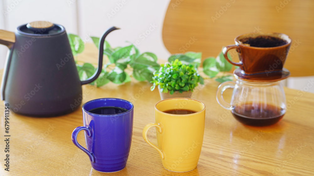 ペアのマグカップ|ダイニングテーブルでドリップコーヒー