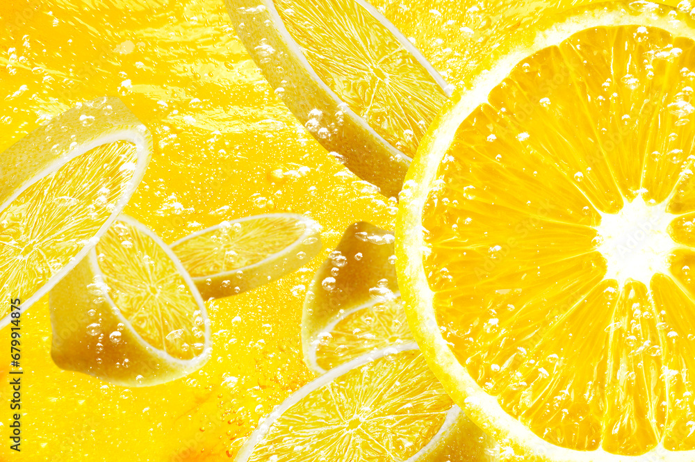 lemon orange slice drop on water soda