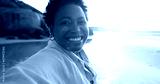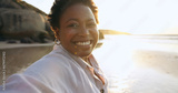 Woman, selfie and smile in portrait at beach, relaxing and peace for social media, post and update on holiday. Happy black person, face and ocean on vacation, getaway and travel, fun and freedom