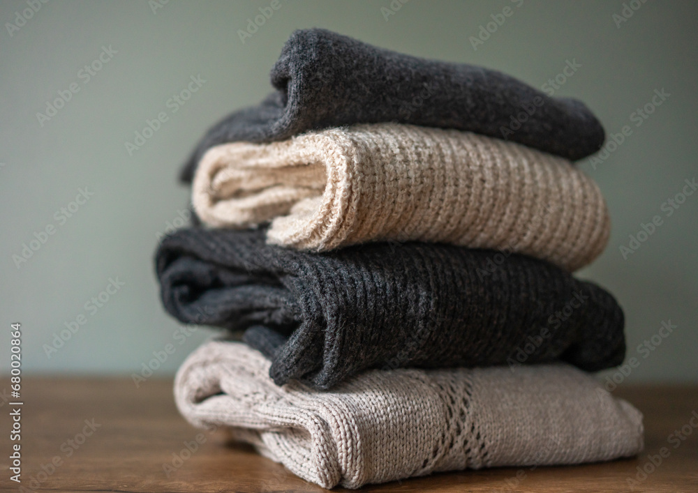 A stack of warm wool sweaters in neutral colors. Warm winter clothes