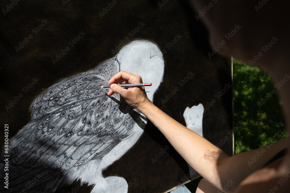Adult Caucasian Woman Drawing a Snow Owl with a Pencil on a Dark Background - Real Artist, Real Artwork on Paper Made for a series of forest Wildlife