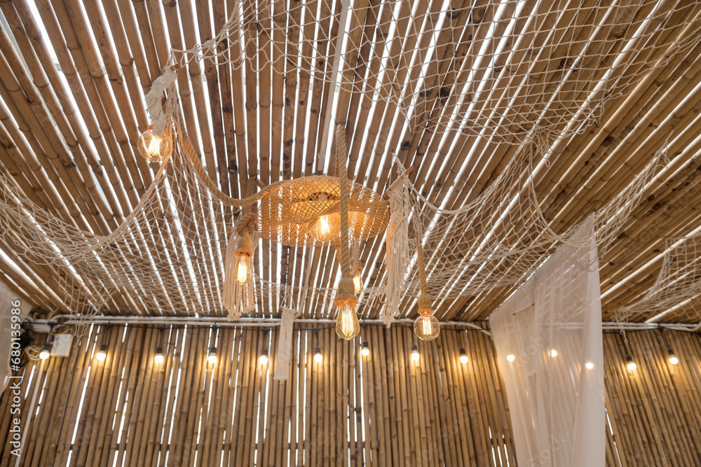 Hanging light bulbs by brown rope on bamboo ceiling in cafe