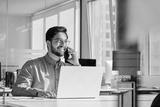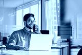 Young happy busy latin businessman talking on phone using laptop computer in office. Smiling hispanic professional business man manager making call on mobile telephone sitting at work desk.