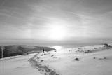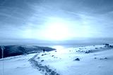 A tourist walks along a snowy mountain slope. Footprints in the snow. There is a solar halo in the sky above the sea. Traveling and hiking in Siberia and the Russian Far East. Magadan region, Russia.