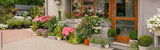 Facade of beautiful flower shop with different housplants and flowers . High quality photo