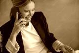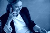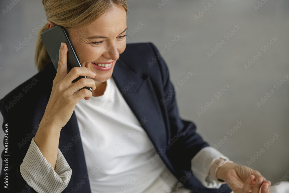 Cheerful businesswoman talking phone sitting on modern office background and looks away
