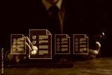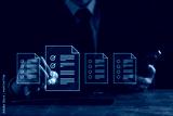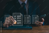 Document management concept, Businessman check electronic documents, survey filling out. digital form checklist on virtual screen Document Management System and Business performance monitoring.
