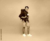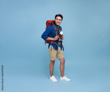 Happy young Asian tourist man holding passport with backpack going to travel on holidays isolated on blue background.