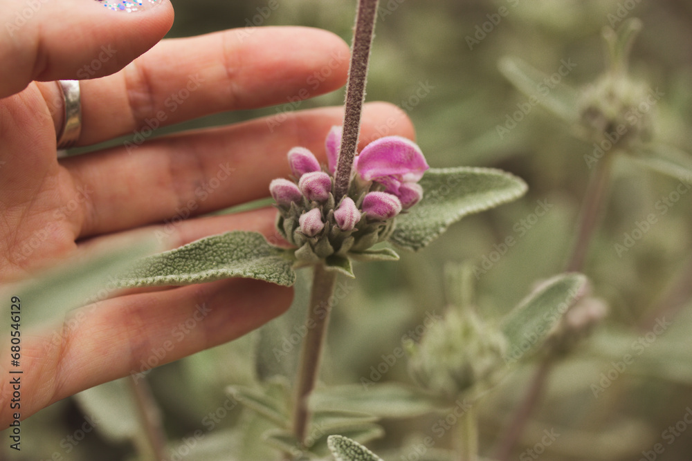 Plants of Jerusalem Sage, Phlomis Purpurea in female hand. A gardener is growing, take care about Mediterranean shrub with beautiful grey-green leaves. Gardens, rockery, groundcover A fresh green leaf