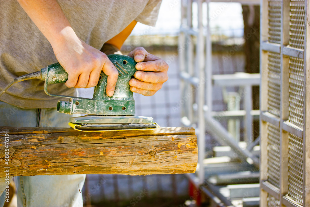 Hands of faceless craftsman using polishing machine on wooden logs. Working on wood with woodworking machine. Carpenter, engineer master working hard. Electric polisher, Orbital sander. Man is working