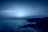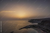 Breathtaking sunset view over Atlantic Ocean on island of Gran Canaria with backdrop of mountains, hotels and sandy beach.