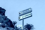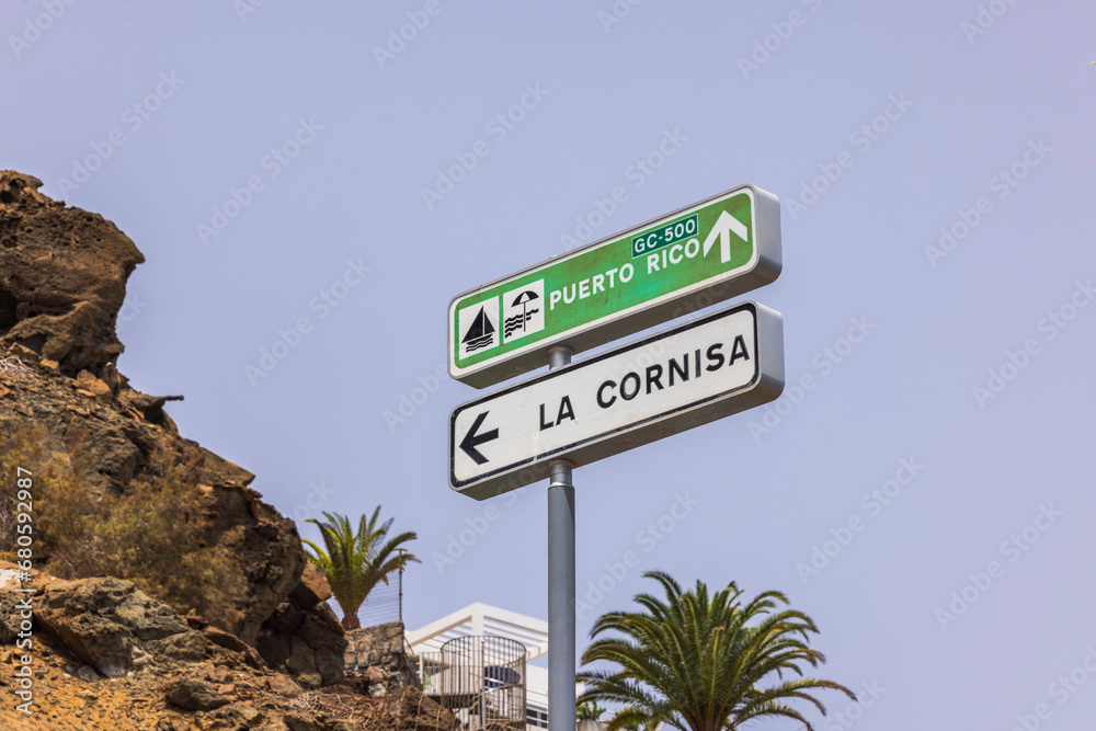 Close-up of signs indicating direction to Puerto Rico Beach and highway towards La Cornisa on island of Gran Canaria. Spain.