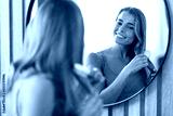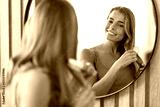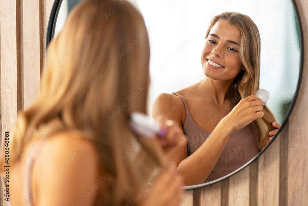 Beautiful smiling cute woman brushing her silky wavy hair using hairbrush looking in mirror, standing at modern bathroom. Natural beauty, morning routine, hair care concept