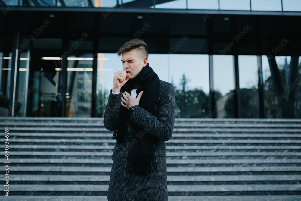 Health Struggle Young Adult Frustration with Flu, Expressing Sneezing and Coughing Outdoors