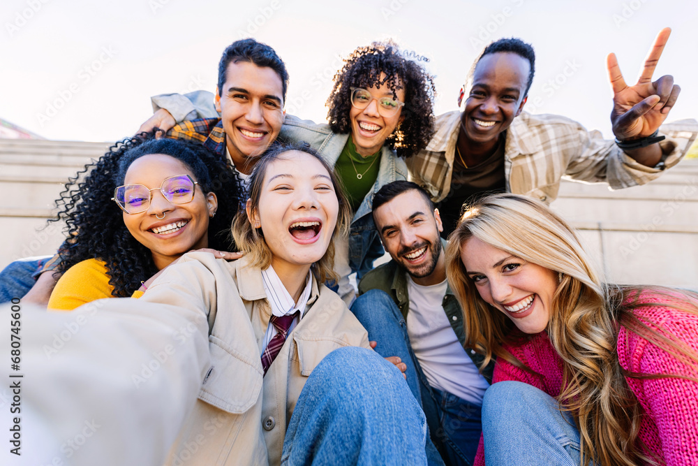 Young community of diverse happy student friends taking selfie portrait together. Millennial group of people having fun enjoying free time outdoors. Youth, diversity and friendship concept.