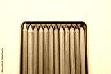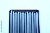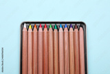 Colorful pastel pencils in box on light blue background, top view. Drawing supplies