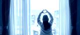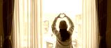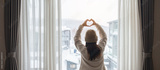 young woman in sweater looking through the window in winter season, happy female rising arms and stretching after waking at apartment or home in the morning. Lifestyle and Relaxing concepts