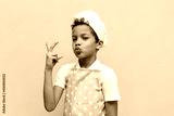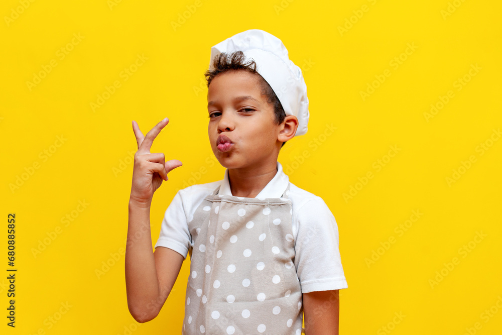 african american boy in chef's uniform and hat shows an italian gesture on yellow isolated background