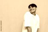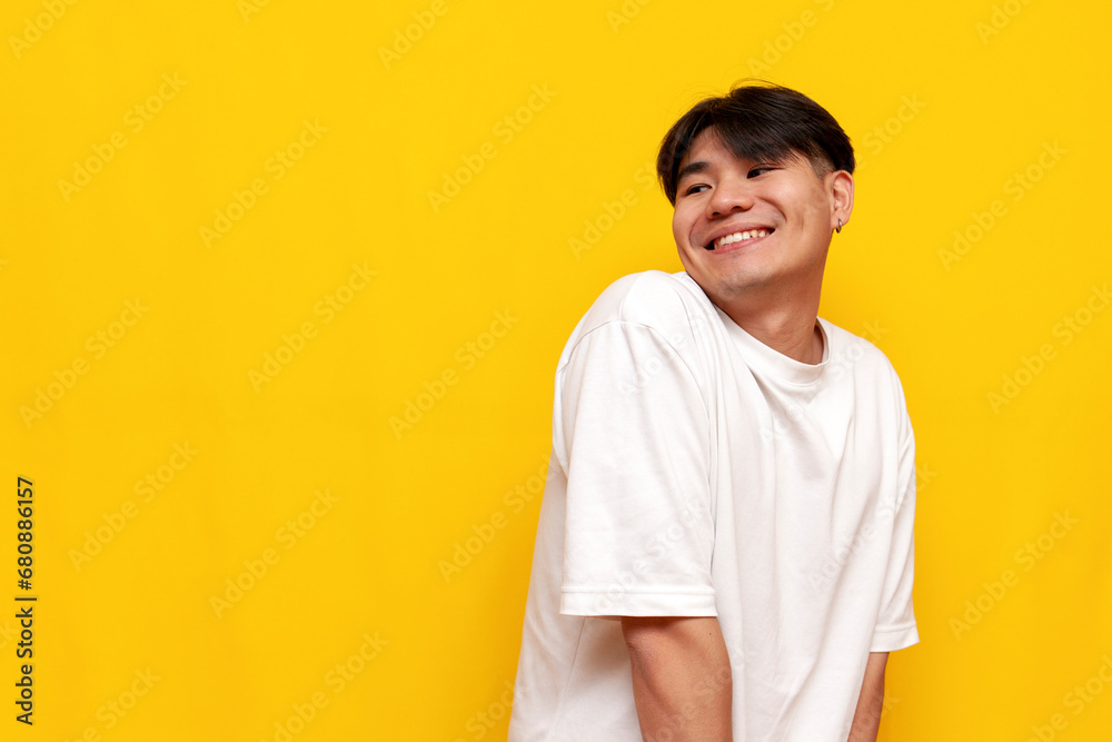 modest young asian guy in white t-shirt is shy and smiling on yellow isolated background, embarrassed korean man