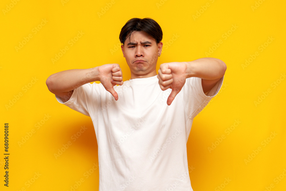 displeased young asian guy in white t-shirt showing dislike on yellow isolated background