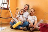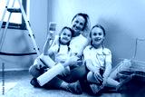 young mother and her daughters are sitting on the floor of the room with brushes and rollers in front of the wall, having fun