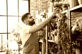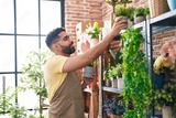 Young arab man florist holding plant standing at florist