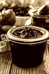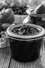 Blueberry jam strawberry jam in glass jar on wooden table