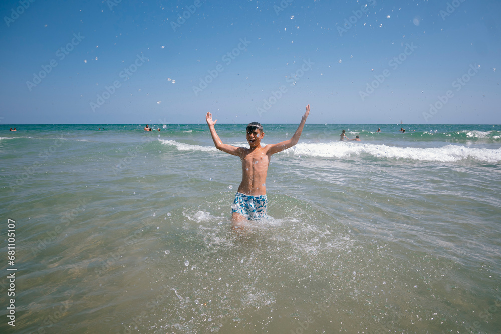 Teenage girl enjoying a fabulous day at the beach. She bathes in the sea.