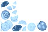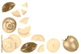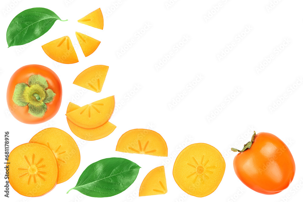 persimmon slice with leaves isolated on white background with copy space for your text. Top view. Flat lay pattern