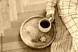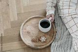 Cozy Christmas scene. Kid, young girl in white checkered pyjamas holding cup of coffee. Mug of hot beverage on wooden plate with gingerbread cookies. Resting concept.. Blurred floor, top view.