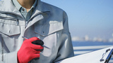 クリップボードを持つ作業服の男性・海と工業地帯│建設業・製造業・プラント イメージ
