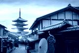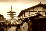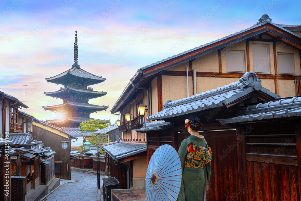 Young Japanese woman in traditional Kimono dress with Yasaka Pagoda at Hokanji temple in Kyoto, Japan during full bloom cherry blossom in spring