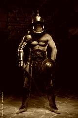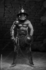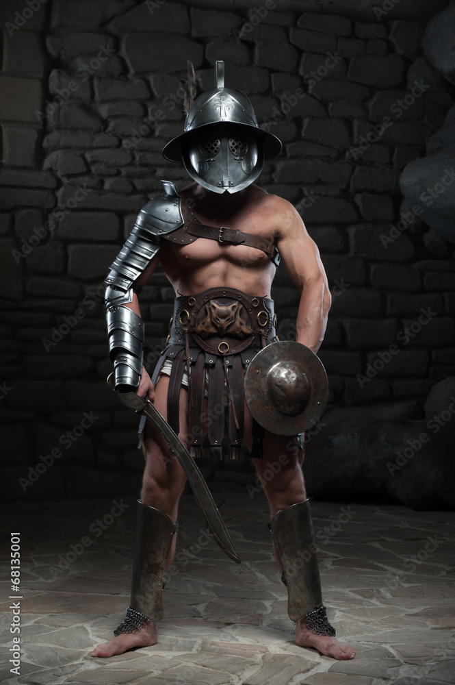 Gladiator in helmet and armour holding sword