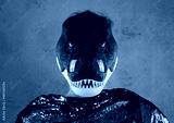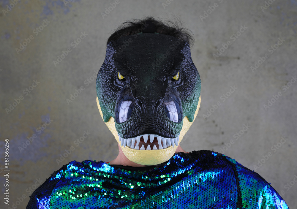 portrait of a man wearing a dinosaur mask