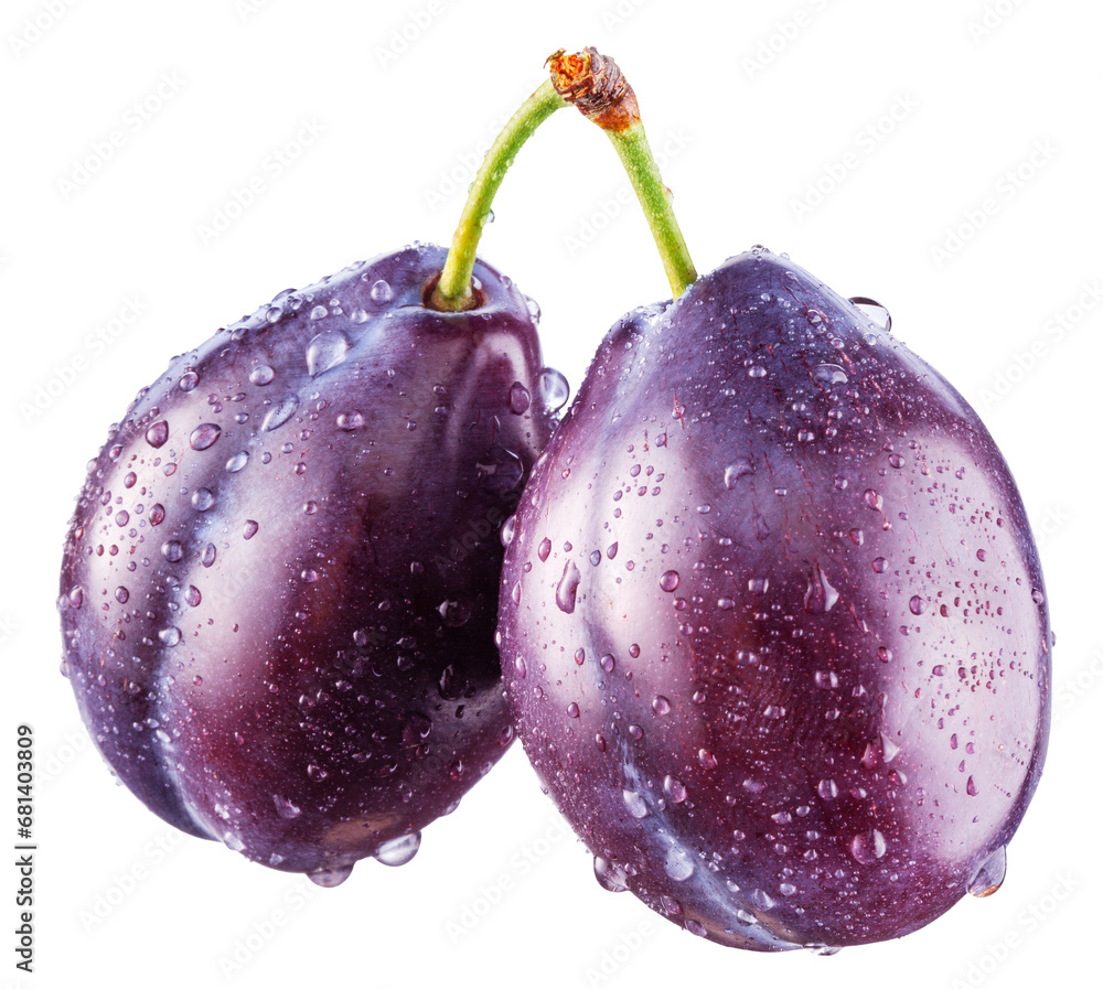 Ripe prune plums covered with water drops on white background. Clipping path.
