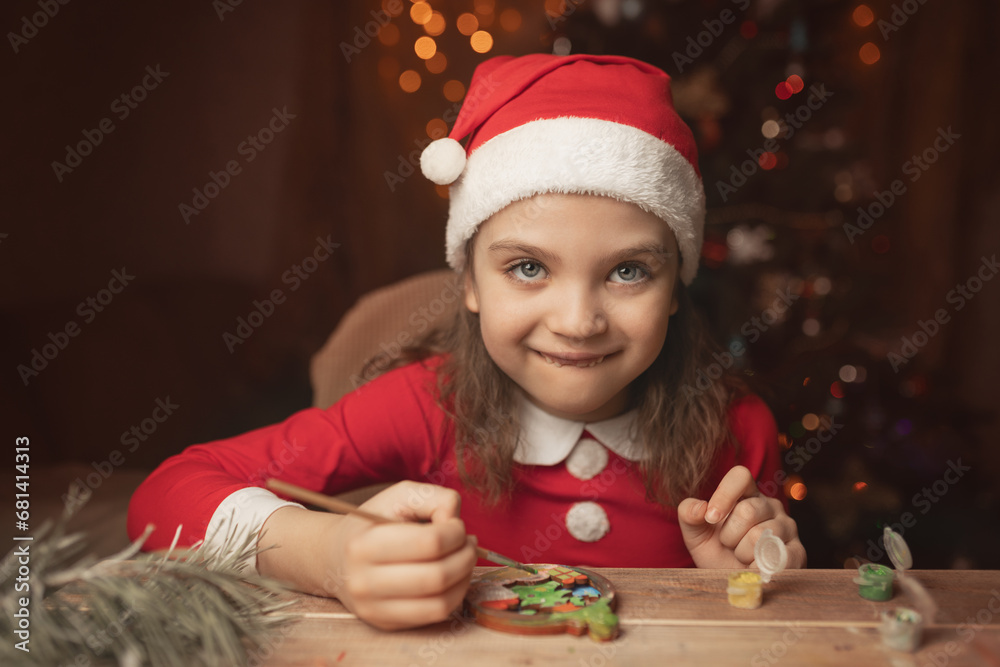 Funny girl in Santa Claus costume decorates Christmas wooden toys