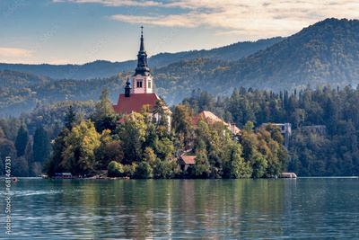 Bled, Slovenia. 09 30 2023. Island on lake Bled with old church