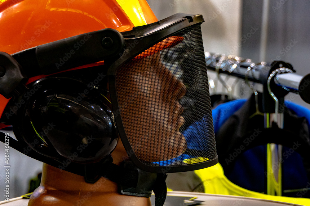 Protective fine-mesh metal mesh attached to a worker s construction helmet.