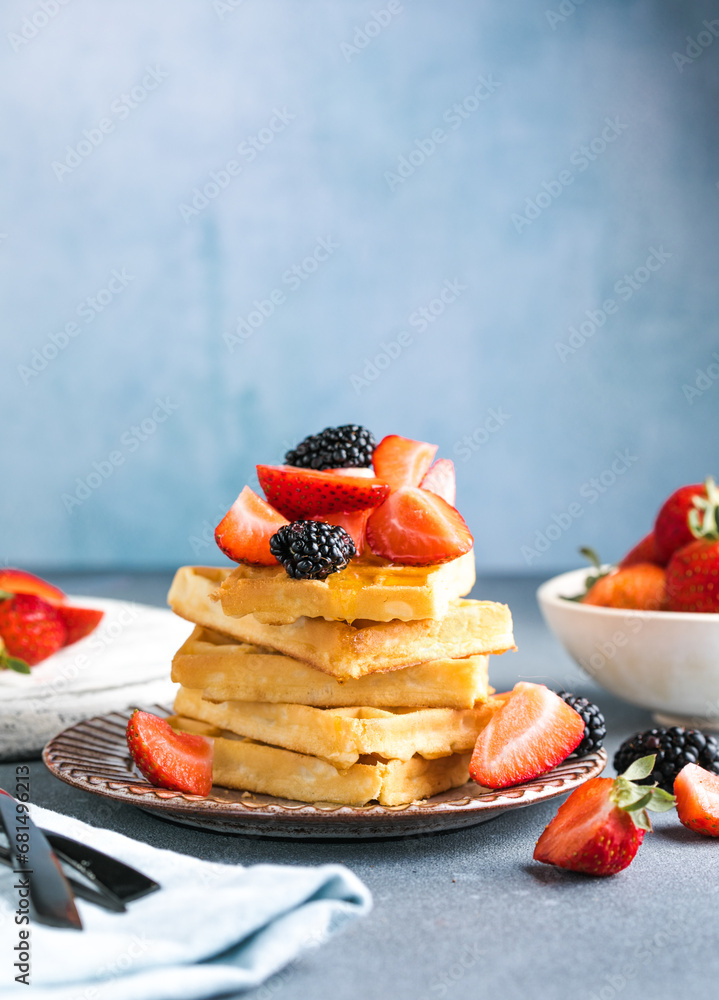 Waffles and Strawberries stacked on a plate. Belgian homemade waffles