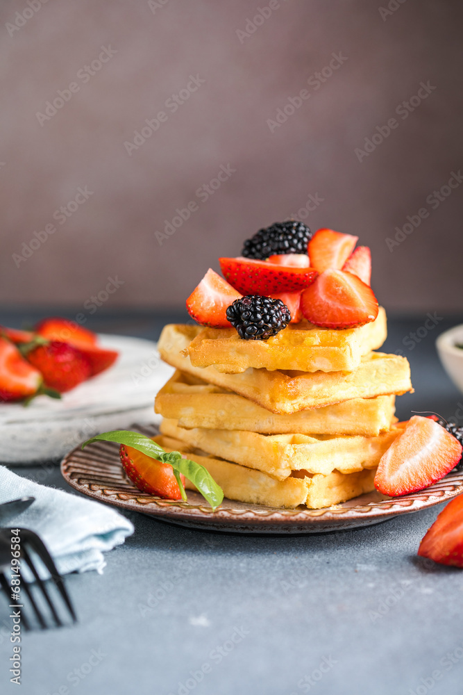 Waffles and Strawberries stacked on a plate. Belgian homemade waffles