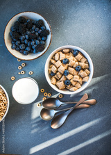 Variety of breakfast whole grain cereals and muesli in bowls on a light wooden background. Fast food. Top view. Space for text.