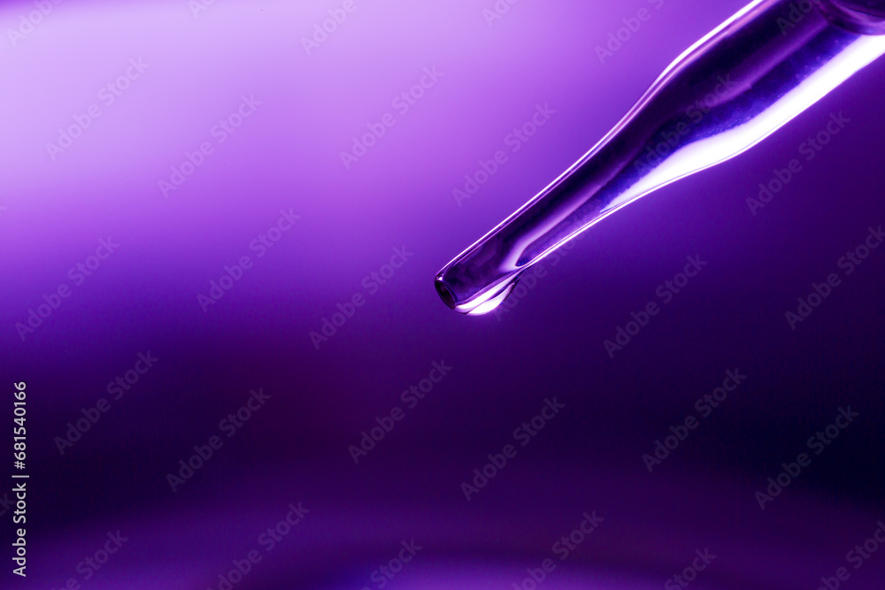 Test tube, medical or science laboratory concept, liquid droplets with droplets in purple tone background, close-up, macro image.
