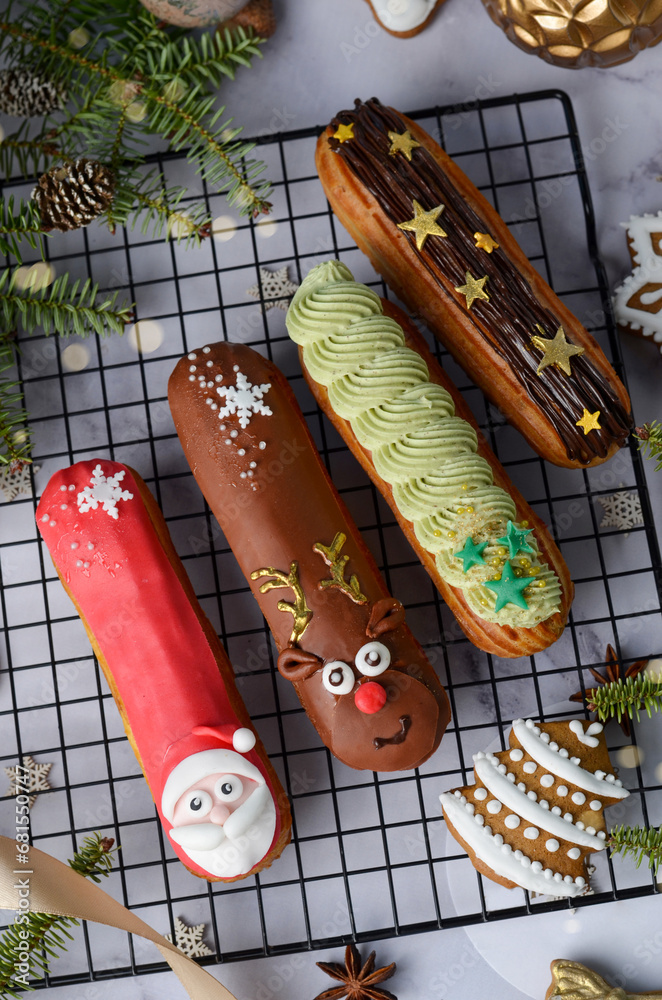 Christmas Eclairs, Glazed Festive Dessert on Bright Background
