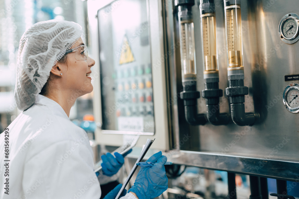 Worker in drinking water plant clean hygiene drink factory quality control monitoring flow meter water purifier machine process.