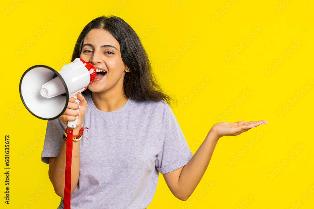 Indian young woman talking with megaphone, proclaiming news, loudly announcing advertisement discounts sale, using loudspeaker to shout speech. Happy Arabian girl isolated on studio yellow background