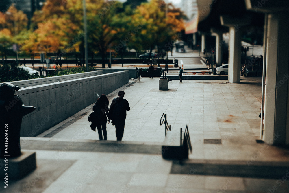 Urban scene and pedestrians. People walking on street descending concrete steps back view. Autumn landscape with colorful bright yellow, brown, green trees. District of Madrid, Spane. Modern lifestyle
