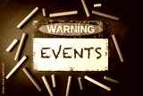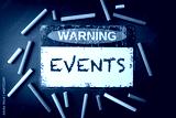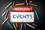 Events. Metal warning sign and colored pieces of chalk on a dark chalkboard background